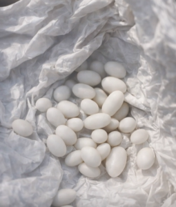 İçinde beyaz toplar vardı, daha doğrusu düzgün biçimli oval küçük yumaklar, pürüzsüz, tuhaf, sanki yapaymış gibi. Tamamen aynı değillerdi ama birbirlerine çok benziyordu. Beyaz, mat, hoş olmayan, nemli bir kokusu vardı ve hemen hoşuma gitmedi. Kesinlikle şekerleme, tablet ya da sıradan bir tatlı değillerdi.