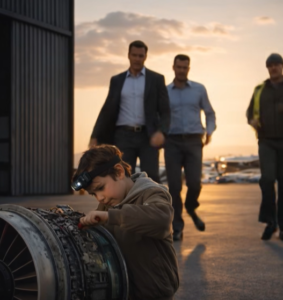 Başta kimse onu fark etmedi. Teknik servis çalışanları gitmeye hazırlanıyordu çünkü bu parçaların artık hiçbir işe yaramayacağından emindiler. Ama bir mühendis tesadüfen arkasına bakınca dondu kaldı. Hemen ne gördüğünü anlayamadı. Pahalı uçak parçalarının arasında, kimsenin dokunmasına izin verilmeyen parçaların yanında, bir çocuk oturuyor ve güvenle bir şeyler tamir ediyordu; sanki bunu daha önce de yapmış gibi.